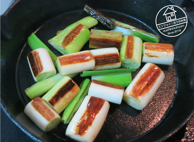 更に焼きネギと焼きニンニク(写真外)を加えました。目的は臭み消しと香ばしい風味を加えるためです。
