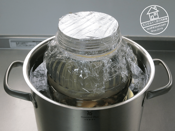 瓶を寸胴(8L)で湯煎します。寸胴の底には蒸し台が入っています。こうすると食材が直に加熱されないので、焦げ付きを防ぐことができます。
