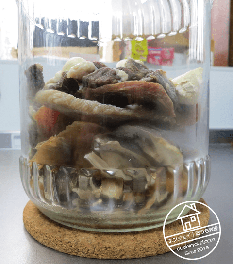 調理法:瓶に乾物を入れて水を注ぎ、12時間湯煎。