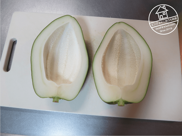 割ると中身はこんな感じです。大きな空洞があり、将来種に成長するであろうイボが沢山内壁についています。