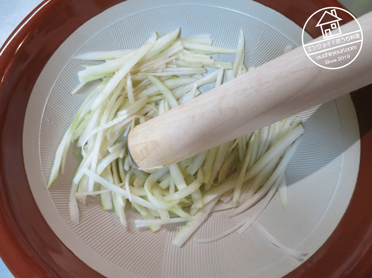 スライサーで繊維にそって千切りにしました。手前の太いのはスライサーにかけられなかった残りの部分を包丁で切ったものです。