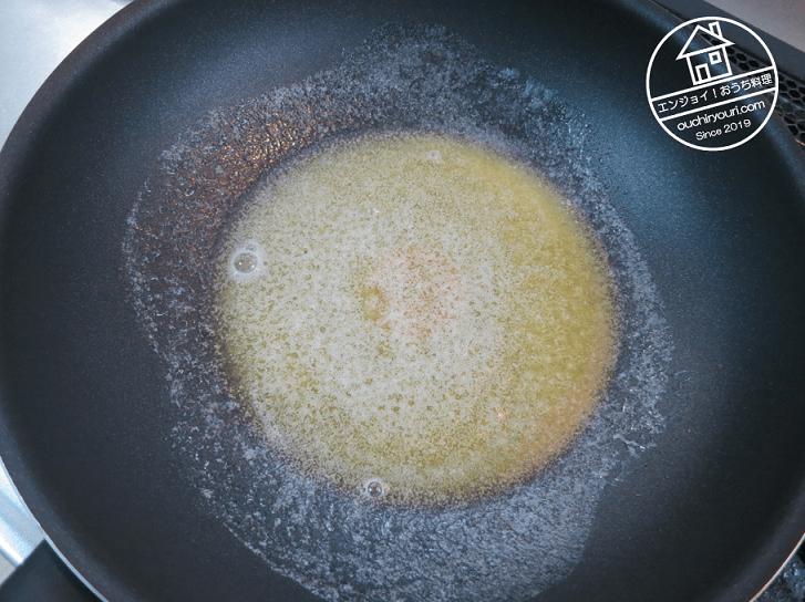 バターを溶かします。バターは加熱しすぎると焦げるので、弱火で加熱します。