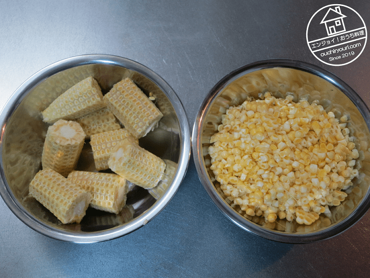 トウモロコシは数分割し、実を包丁で切り取ります。芯も使うので捨てずにとっておきます。