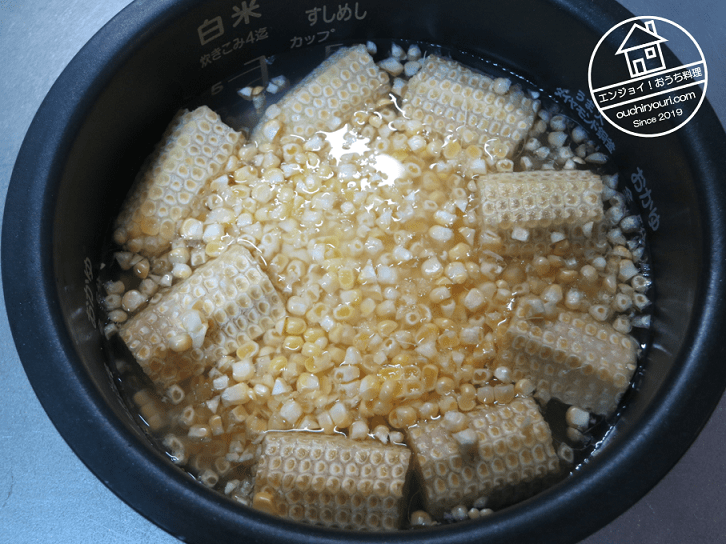 米は普通に洗浄、水分調整、吸水させます。塩を少量混ぜ、上にトウモロコシの芯と実を置きます。芯からも良い味が出ます。