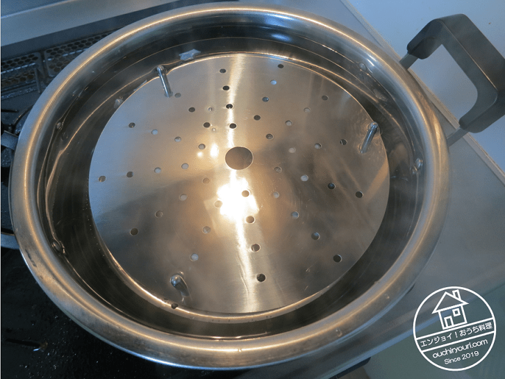 大鍋に熱湯をたっぷりと沸かします。鶏肉を袋ごと湯に沈めて、蓋をして余熱で火を通します。この際、蒸し台で上下から鶏肉の袋をサンドイッチにして肉を鍋の中心に据えました。
