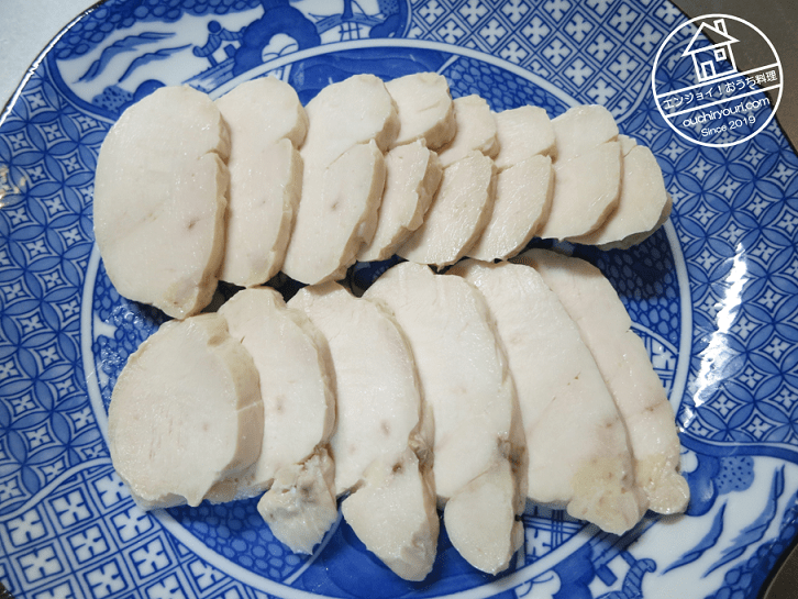 鍋が冷えるまで放置したら鶏ハムの完成です。熱をかけすぎないことでしっとりと仕上がります。鶏胸肉にありがちなパサつき感が生じません。