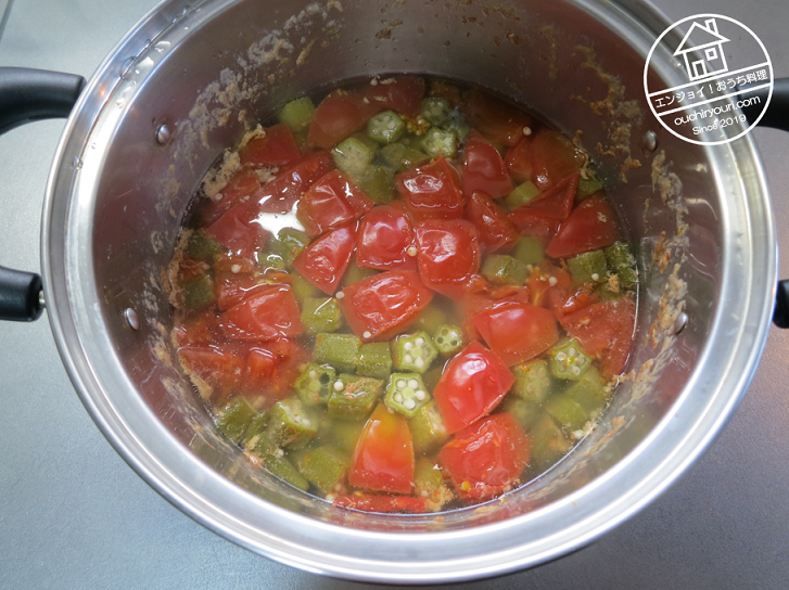 鶏のスープでオクラとトマトを煮て軟らかくします。オクラでモロヘイヤの粘りを代用します。