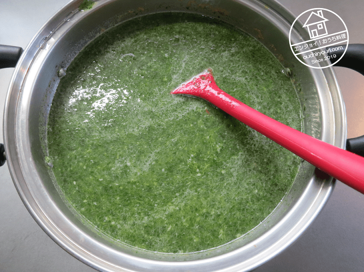 やってみて気付いたのですが、ほうれん草の繊維は柔軟で、バーミックスでは切れないです。長い繊維はヘラなどに絡まってしまうので、お浸しの段階で出来るだけ包丁で細かく刻んでおいた方が良いです。