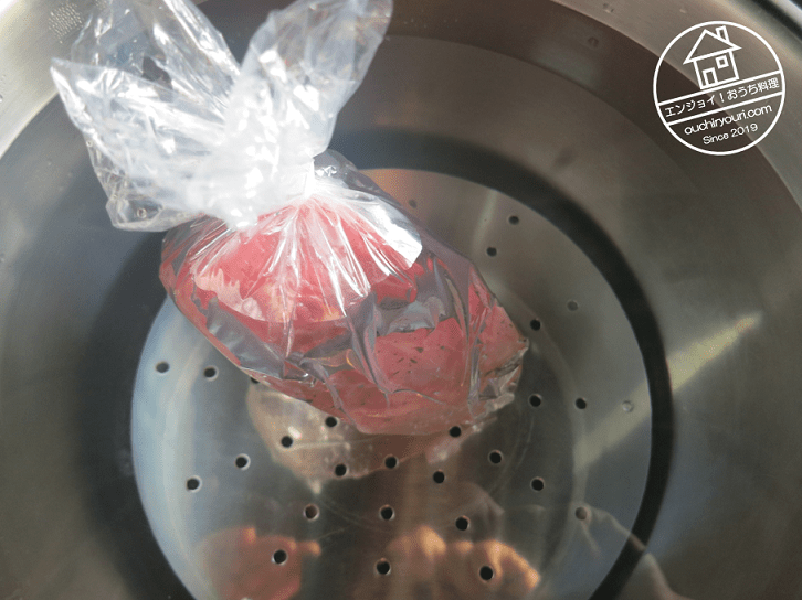 8Lの寸胴いっぱいに63℃のお湯を張ります。底や壁面は放熱で温度が下がるので、底や壁面に当たらないように肉を配置します。