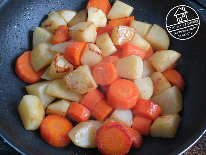 ジャガイモと人参も炒めて入れます。玉ねぎ、ジャガイモ、人参は欠かせない三種の神器です。