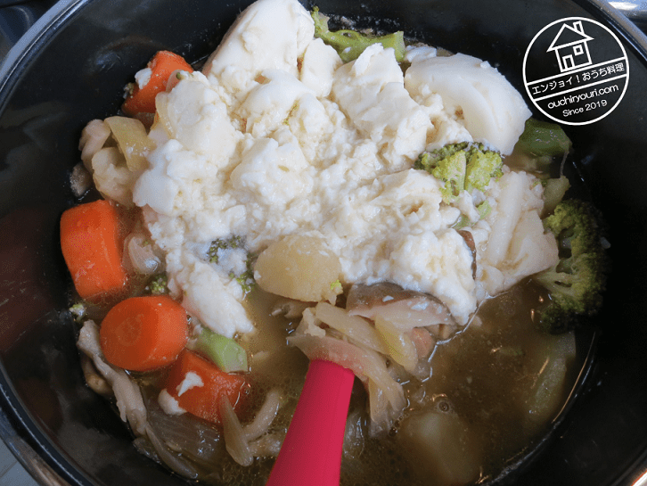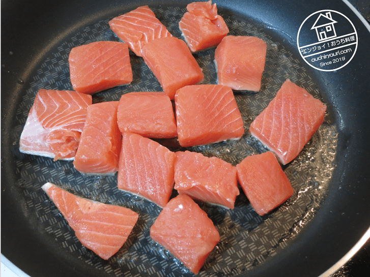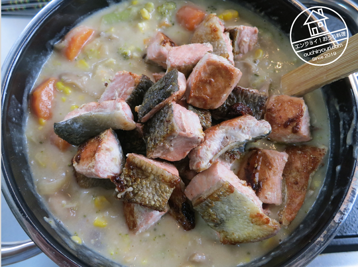 最後に鮭を投入します。鮭は身が崩れやすいので、一番最後に入れます。
