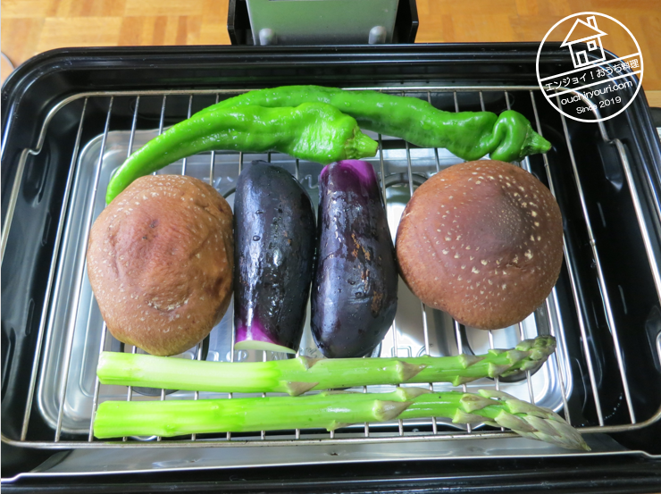 今回は万願寺唐辛子、茄子、しいたけ、アスパラガスを焼きました。魚焼きグリルを使えば油を使わずに焼けるのでとてもヘルシーです。