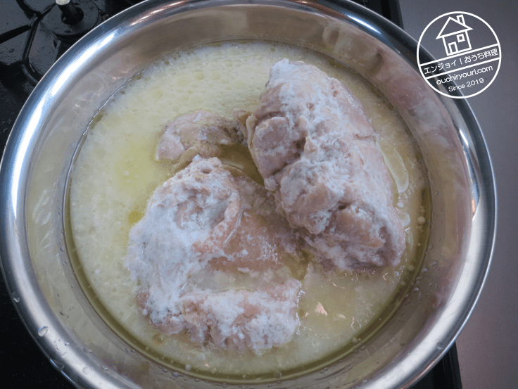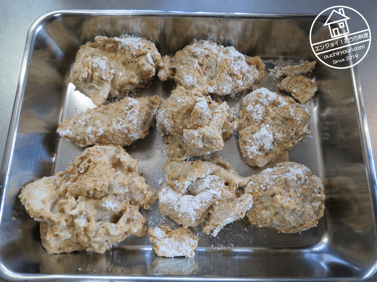 卵液に肉をくぐらせ、粉をつける作業を2回行いました。肉が軟らかすぎて扱いにくかったです。KFCが骨付きの理由は崩れにくくするためと、骨を抜くコストを減らすためだと思います。