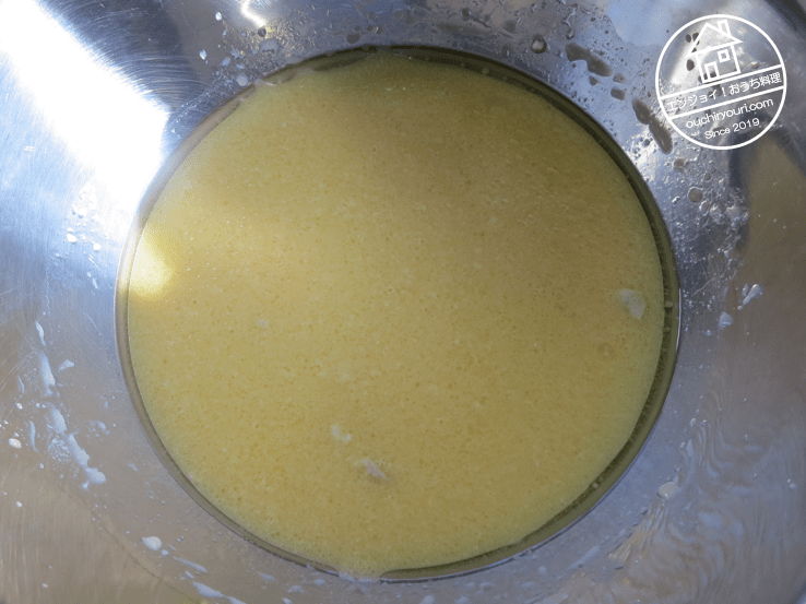 汁(脂含む)に卵を加え、混ぜました。卵黄の乳化作用に期待しましたが、全部の脂は乳化しきれませんでした。