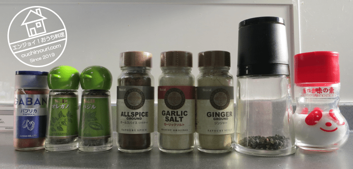 スパイス類です。味の素、黒胡椒、ジンジャー、ガーリック、オールスパイス、バジル、オレガノ、パプリカです。