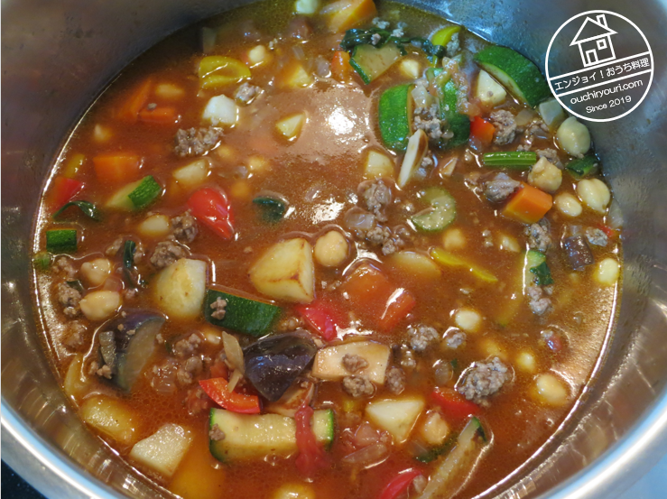 以上の食材全てとホールトマト缶1個、デミグラスソース缶1個、赤ワイン、ソースを加えてしばし煮ます。