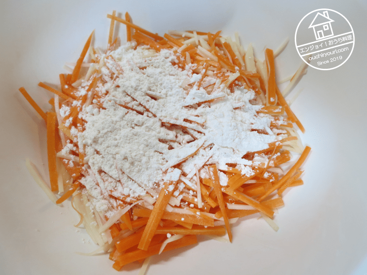 人参はジャガイモほど澱粉がないので、まとめるために小麦粉を少々加えて混ぜます。