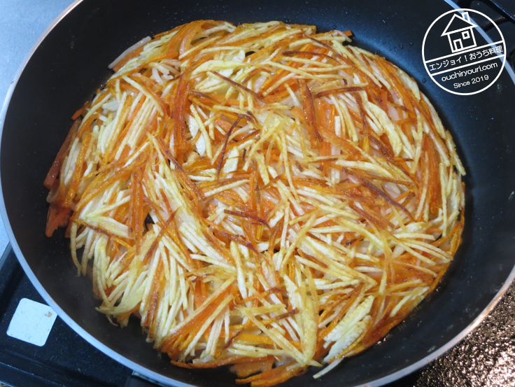 うどんのお供にかき揚げが欲しいと思ったのですが、揚げ物をするのは面倒だし、油を大量に摂取するのが嫌だったので、かき焼きを作ることにしました。調理法としてはガレットと同じです。