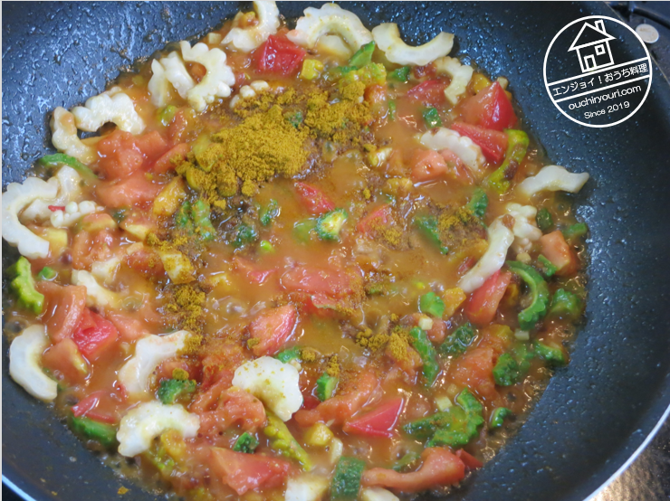トマトが溶けたらカレー粉を投入します。