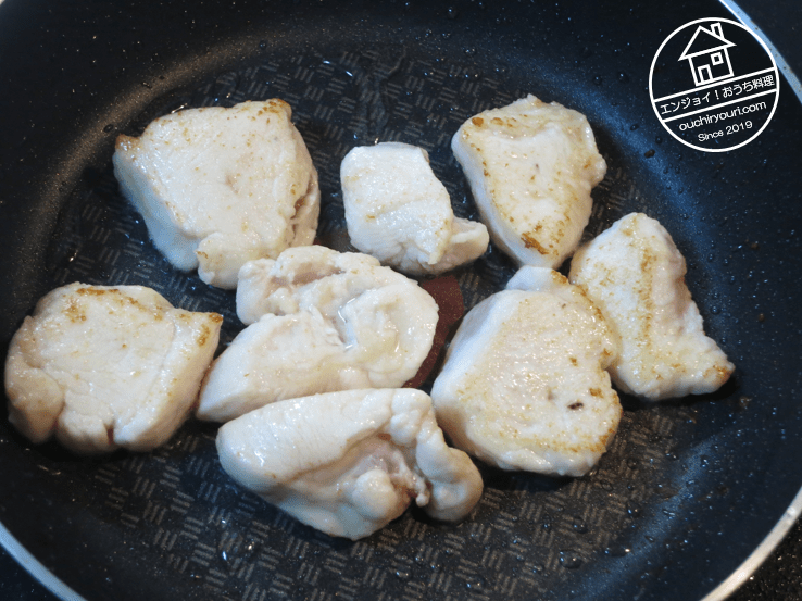 鶏胸肉は皮をはいで一口大に切り、薄力粉をまぶします。薄力粉をまぶすとソテーしたときに軟らかく焼き上がります。ごく薄い膜ができるだけなのに不思議です。またソースが絡みやすくなります。