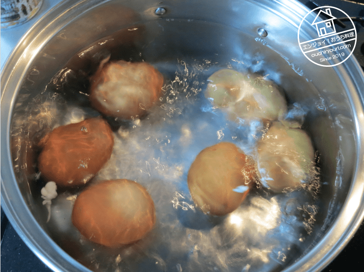 先ず、茹で卵を作ります。茹で卵の作り方のコツを以下に記します。①卵のお尻に画鋲で穴をあける。②卵は割らないように手網などでそっと熱湯に入れる。③黄身が偏らないようにさい箸で動かしながら8分茹でる。④茹でている間に氷水を用意しておき、熱湯から手網で揚げたら即氷水につける。①と④が殻を綺麗に剥くコツです。