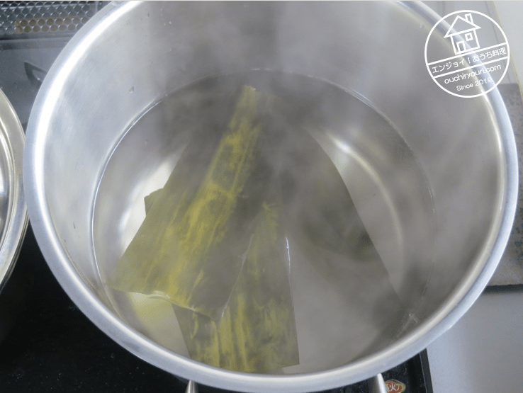 昆布でダシをとります。予め水に数時間浸して置いて・・・などは現実的には無理なので気にしないことにします。熱湯に投入しますがグツグツ煮ないことでOKとします。ダシガラの昆布は結んでおでんの具にします。