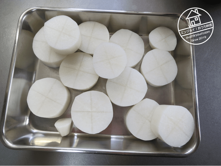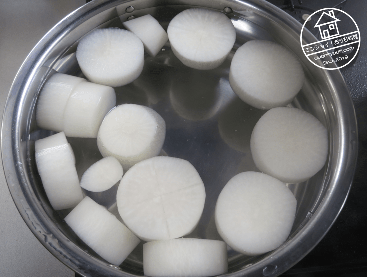 大根を30分ほど下茹でします。米のとぎ汁を使うと良いそうですが、なかったので水です。下茹ですると臭みが抜けます。また生のまま塩の効いたダシ汁に野菜を入れると浸透圧で身が縮んでしまうので、それを防ぐためでもあります。