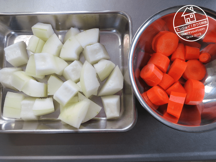 冬瓜と人参です。冬瓜は普通あまりおでんに使いませんが、ダシとの相性の良い食材なので今回は使ってみることにしました。