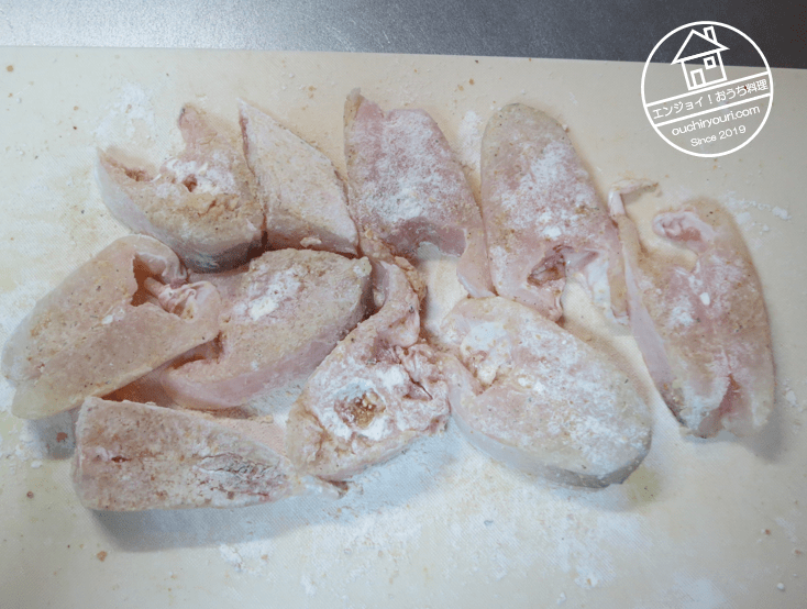 切り身の水気をキッチンペーパーでふき取り、シーズニングソルトを振ります。その上から薄力粉をまぶします。