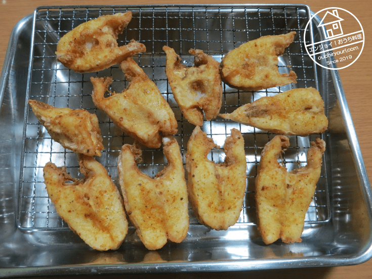 新鮮な魚なら骨の中が多少生でも大丈夫ですし、そもそも骨が細くて火がすぐに通るので、圧力釜なしで作れるお手軽フライドチキンとして楽しめます。