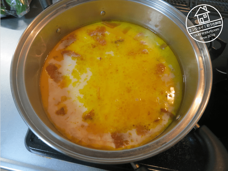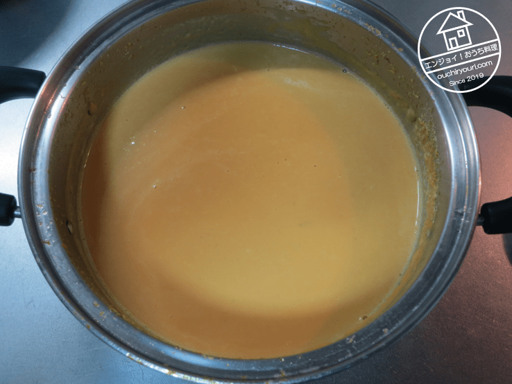 次に水で2時間ほど煮ました。澱粉をしっかりと膨潤させた方が食感が滑らかになると思ったからです。牛乳を加え一煮立ちさせます。