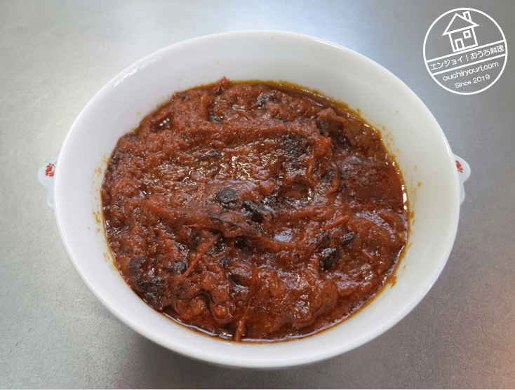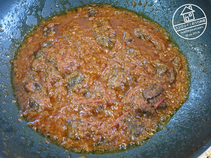 暫く炒めるとトマトは完全に溶けます。冷凍飴玉ニンニクとカレー粉と塩を加え煮詰めます。