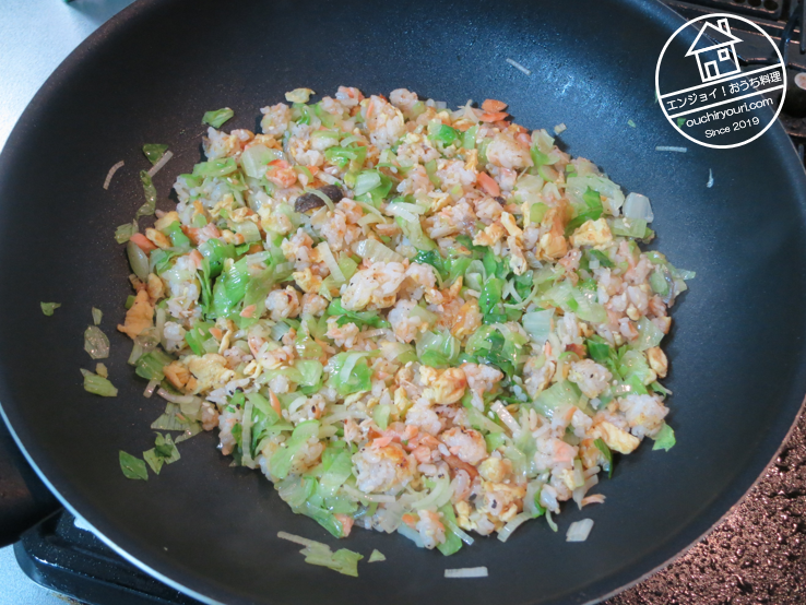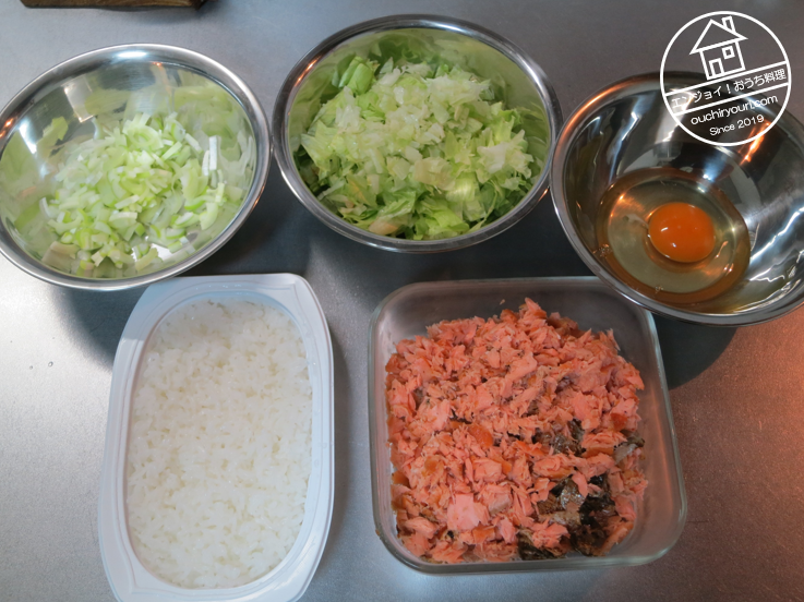 その鮭のほぐし身を使ってレタスチャーハンを作ります。チャーハン作りは短時間勝負なので、食材や調味料を全て揃えておくことが大事です。