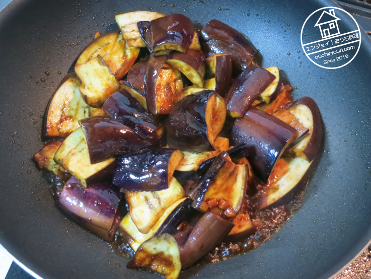 茄子、ピーマン、人参、豚肉を加えて炒めます。炒まったら、中華スープを注ぎ、水分を飛ばしながら煮つめます。