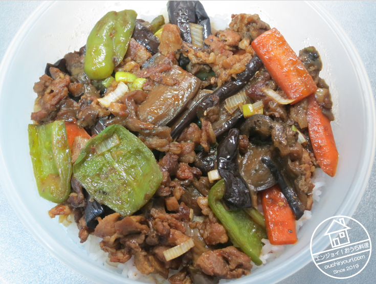 ご飯の上に麻婆茄子を乗っけてお弁当にしました。煮詰めて片栗粉でとじているので、お弁当に持たせても大丈夫です。
