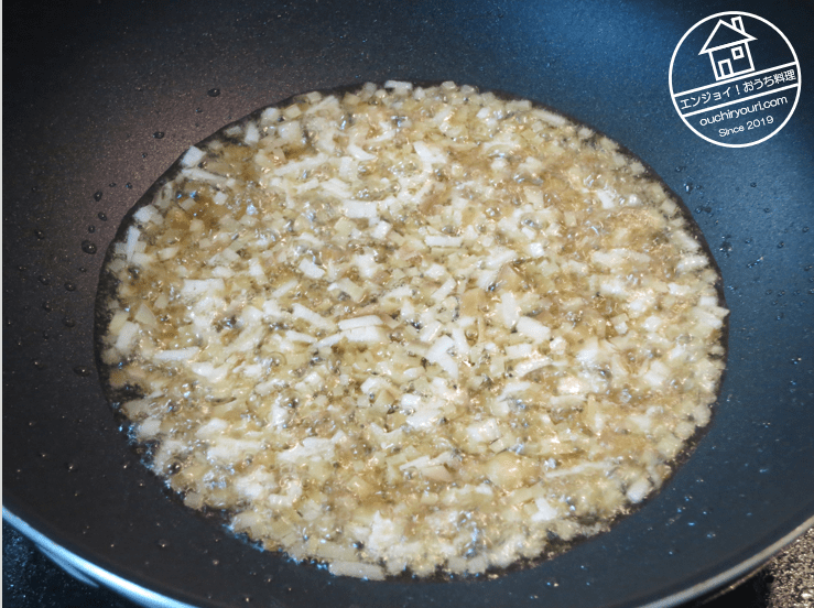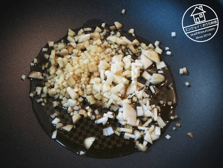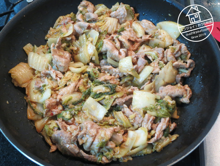 「豚肉はキムチと共に炒めて下味を付けた方がよい。」という情報があったので試してみます。どの段階でキムチと合流させるべきか不明でしたので、生肉の段階で合流させてみました。