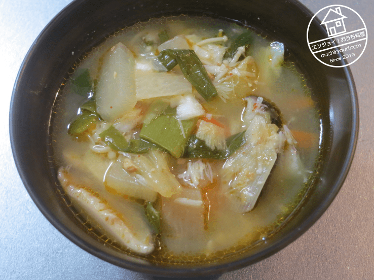 豚キムチ、タラ、大根、ネギ、エノキ、人参、干し椎茸とその戻し汁、を煮込み、味噌で味付けして完成です。