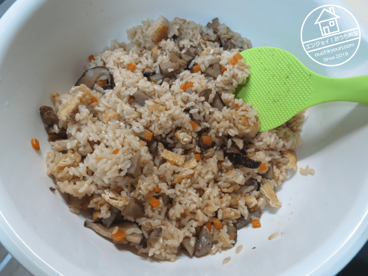 できました!炊飯窯がいっぱいで混ぜられなかったので、半分をボウルにとって混ぜました。モリモリに具を入れたのですが、出来上がってみると普通ですね。