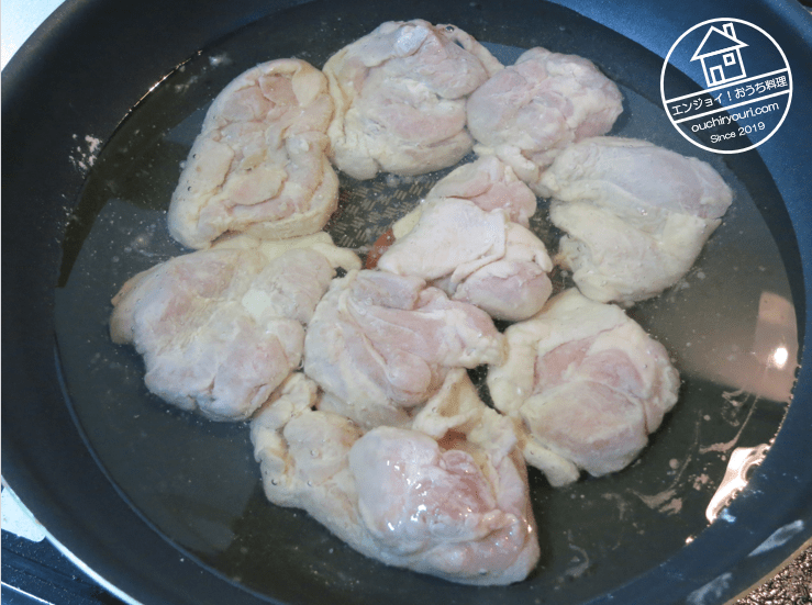 梅紫蘇醤油で1日漬け込んだ鶏モモ肉です。モモ肉は1枚を6分割に大きめに切ってあります。揚げると体積が半分になるので大きめの方が良いです。