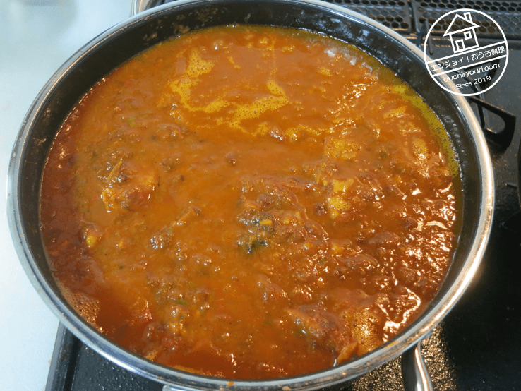 以上の全てを鍋に入れ、水を注ぎ、塩で調味して少し煮たら完成です。途中の工程でみっちり煮詰めたのに、最後に水を加えるところに矛盾がありますが、その方が美味しいカレーになります。