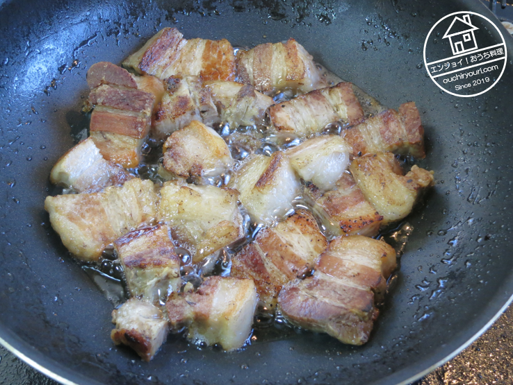 豚バラ肉を2時間蒸して脂を抜き更に軟化させました。 蒸したら体積が半分になりました。 蒸した理由は、煮ると旨味が煮汁に出てしまうと思ったからです。