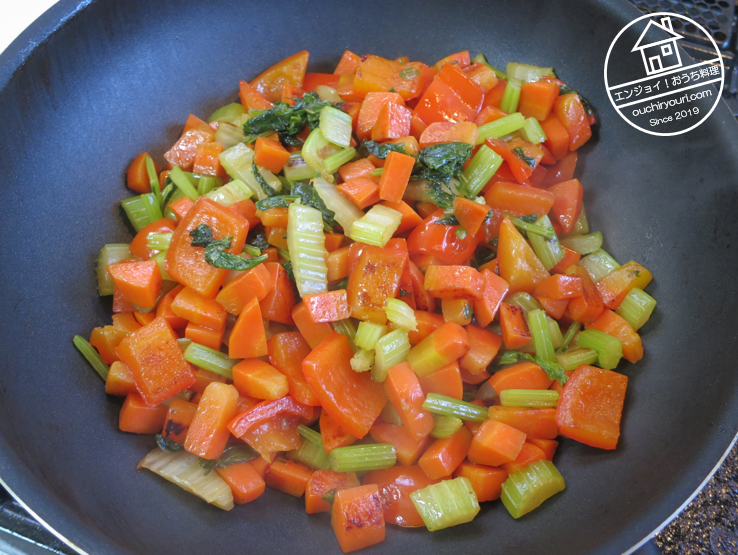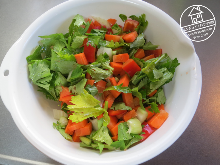 香味野菜です。人参、セロリ、パプリカです。ニンニクと生姜もここに入れておけば良かったです。