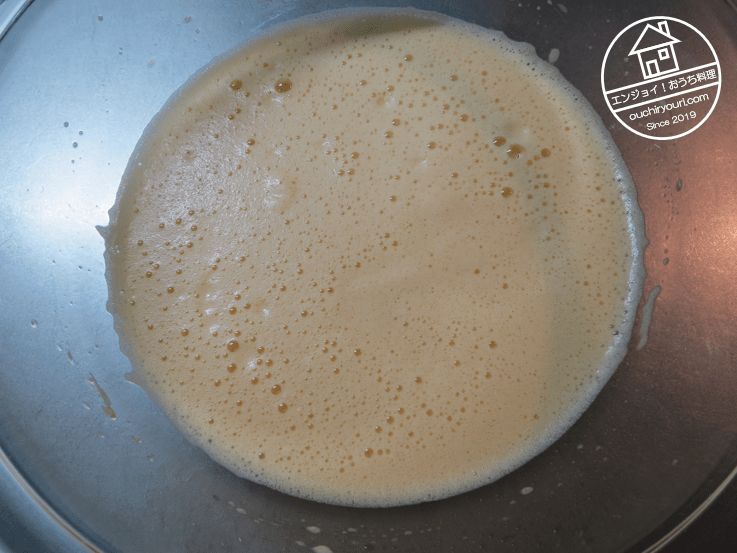 全卵4個に砂糖40g加えて泡立て、小麦粉を加え馴染ませます。小麦粉はあまり練らないように意識します。牛乳30ccを加えまた馴染ませます。