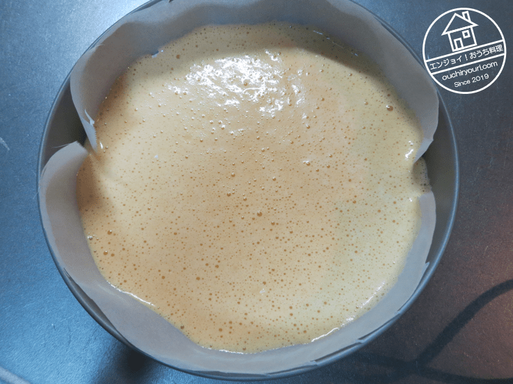ケーキ型にクッキングシートを敷いて生地を流し込みます。シートがちょっと短かったですが、細かいことは気にしないことにします。