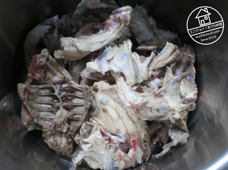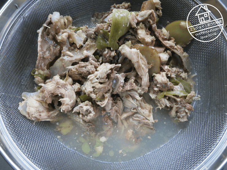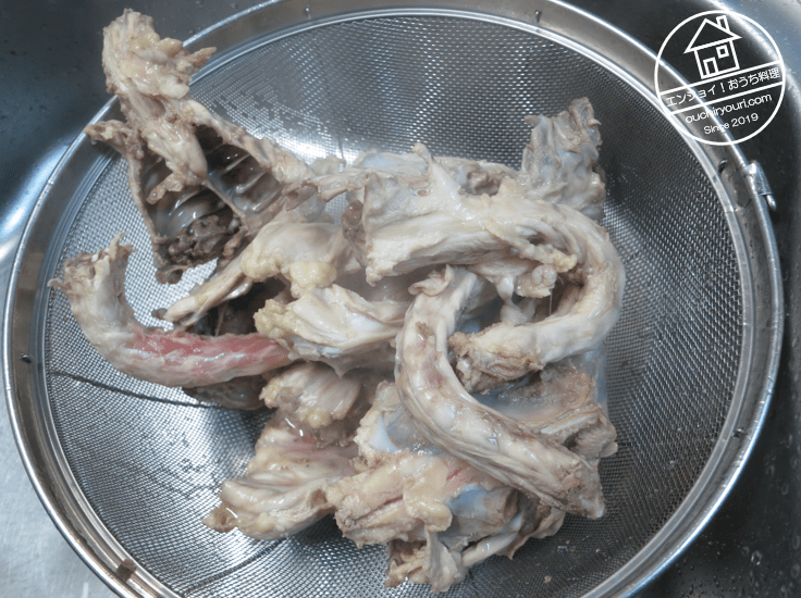 5時間程煮込んだらガラを除去してスープのみにします。ガラの肉をつまんで食べてみましたが、味が完全に抜けていて美味しくなかったです。これは流石に食べられないと思い、残念ながら廃棄しました。