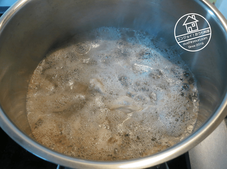 鶏ガラ2羽分に硬水3Lを加えて煮込みます。するとまたアク(主に血由来のタンパク質の塊と思われる)が沢山出ました。一旦茹でこぼしているのにこんなにアクが出たのは硬水の効果かもしれません。すくいとって捨てました。