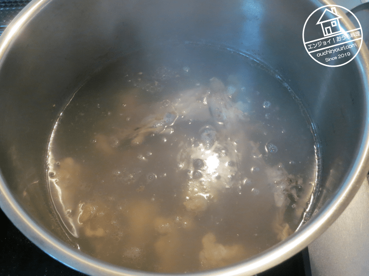 先ずは下処理です。寸胴に熱湯を沸かし鶏ガラを投入してさっと茹でます。