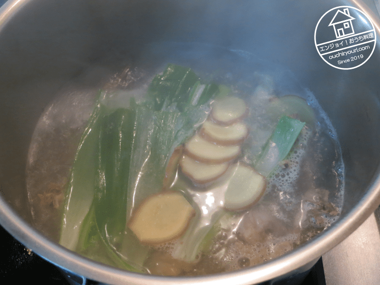 長ねぎの青い部分と生姜1塊のスライスを加えて煮込みます。生姜の香りは皮に多く含まれているので、皮は剥きません。アクが出たらまた掬って捨てますが、一緒に油を除去しすぎるとスープがあっさりしすぎてしまうので注意です。