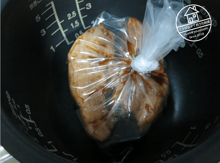 炊飯器に肉とお湯を入れ、保温モード(74℃)で1晩保温調理します。