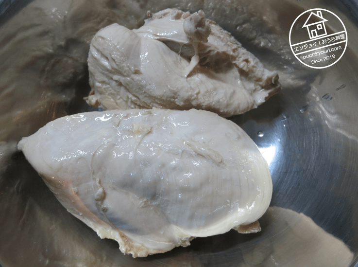 こちらは鶏チャーシュー(正しくは茹で鶏)です。ガラスープを鍋いっぱいに沸騰させ、皮を剥いた鶏胸肉を入れて、ひと煮たちさせてから火を消し1晩放置しました。こうするとパサつきがちな鶏胸肉をしっとりと仕上げることができます。また旨味成分が濃厚なスープで茹でることで、肉の味がスープに抜け出るのを防ぐことができます。